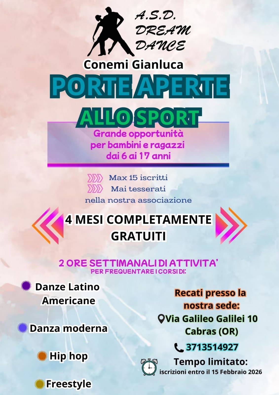 Per info e adesioni vieni presso la nostra sede che si trova a Cabras (OR) via Galileo Galilei 10. Cell. 3713514927.